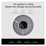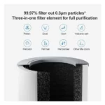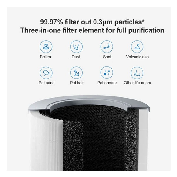قابلیت تصفیه هوا ۲۳۰ متر مکعب در ساعت منطقه تحت پوشش موثر: ۱۶-۲۷ متر مربع دو کاربرده مناسب برای روی میز و روی زمین حذف آلرژن برای افراد حساس به آلرژی نمایشگر با قابلیت نشان وضعیت آلودگی مناسب برای فضای تا ۴۸ متر مربع قابلیت تنظیم خودکار سرعت فن فیلتراسیون ۹۹.۹۷ درصد ذرات معلق به اندازه ۰.۳ میکرون نویز بسیار کم ۲۰ دسیبل قابلیت تصفیه گرده ها ، گرد و خاک ، دود سیگار ، خاکستر آتش ؛ بو و موی حیوان خانگی ، شوره حیوانات خانگی و … دارای گواهی مراقبت از آلرژی TUV قابلیت کنترل از طریق نرم افزار : قابلیت تنظیم قدرت فن ، زمانبدی شروع به کار ، مشاهده کیفیت هوا و تنظیم قفل کودک پشتیبانی از دستیار صوتی مصرف انرژی بسیار بهینه در کمترین حالت به ۰.۷ کیلو وات ساعت برای یک شبانه روز ترکیبی از دو فناوری فیلتر ، فیلتراسیون الکترواستاتیک و مکانیکی استفاده از فیلتر هپا با تاثیر زیاد دارای فیلتر با سه لایه ، لایه اولیه مناسب برای گرد و غبار و مو های بزرگ ، لایه دوم فیلتر هپا با تاثیر زیاد ، لایه سوم فیلتر کربن فعال