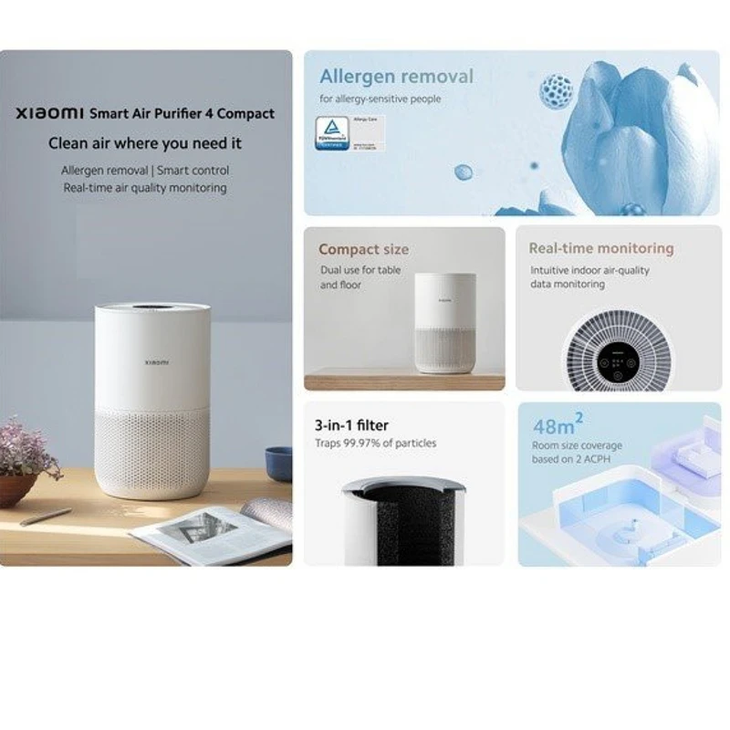 دستگاه تصفیه هوای هوشمند شیائومی 4 کامپکت، هوای تمیز را در جایی که به آن نیاز دارید ارائه می‌دهد. این یک محصول نوآورانه، به ویژه برای افراد حساس به آلرژی است. همان‌طور که از نام آن پیداست، به عنوان جمع‌و‌جور طراحی شده است. می‌توانید برای میز و کف از دستگاه تصفیه هوا استفاده کنید. مجهز به فیلتر 3 در 1 است. ذرات کوچکی به اندازه 0.3 میکرون را به دام می‌اندازد. اندازه دستگاه تصفیه هوای هوشمند شیائومی 4 کامپکت کوچک است؛ اما ویژگی‌های آن بزرگ است. هوای تازه آن، خستگی را از بین می‌برد و از سلامت تنفسی خانواده شما محافظت می‌کند. بی سر و صدا کار می‌کند، زمانی که دستگاه تصفیه هوا کار می‌کند می‌توانید کار کنید. دستگاه تصفیه هوای هوشمند 4 کامپکت 99.97 درصد ذرات کوچک 0.3 میکرون را به دام می‌اندازد. دارای فیلتر 3 در 1 برای تصفیه است. می‌تواند آلاینده‌های هوای داخل خانه را لایه به لایه از بین ببرد. برخلاف دیگر دستگاه‌های تصفیه هوای شیائومی که طراحی جعبه‌ای شکل دارند، دستگاه تصفیه هوای هوشمند 4 کامپکت دارای فرم استوانه‌ای و رومیزی است. وزن آن فقط 2.2 کیلوگرم و دارای قطر 220 میلی‌متر و ارتفاع 355 میلی‌متر است. علاوه بر این، دارای 230 متر مکعب بر ساعت CADR و سنسور PM 2.5 IR است. در حالی که فاقد حسگرهای دما و رطوبت است که در سری 4 تصفیه‌کننده هوای هوشمند بزرگ‌تر یافت می‌شود، مدل جمع‌وجور می‌تواند بوی باکتری‌ها و آلرژن‌‌های رایج مانند موهای حیوانات خانگی و گرده را فیلتر کند. علاوه بر قابلیت حمل، از مزایای دستگاه تصفیه هوای هوشمند 4 کامپکت، می‌توان به میزان نویز و مصرف انرژی اشاره کرد. این پاک‌کننده تنها با حداکثر توان مصرفی 27 وات در مقایسه با نسخه Lite با خروجی 33 وات رتبه‌بندی شده است. سطح نویز در حالت خواب 20 دسی‌بل است و در حداکثر تمیز کردن به 50 دسی بل می‌رسد.