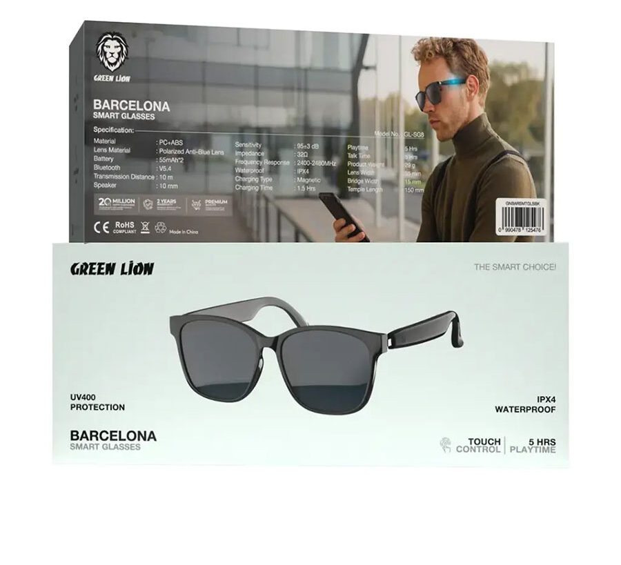 عینک هوشمند Green Lion مدل Barcelona Smart Glasses است . یک گجت پوشیدنی مدرن که طراحی کلاسیک عینک آفتابی را با امکانات بلوتوثی و فناوری صوتی هوشمند ترکیب میکند.